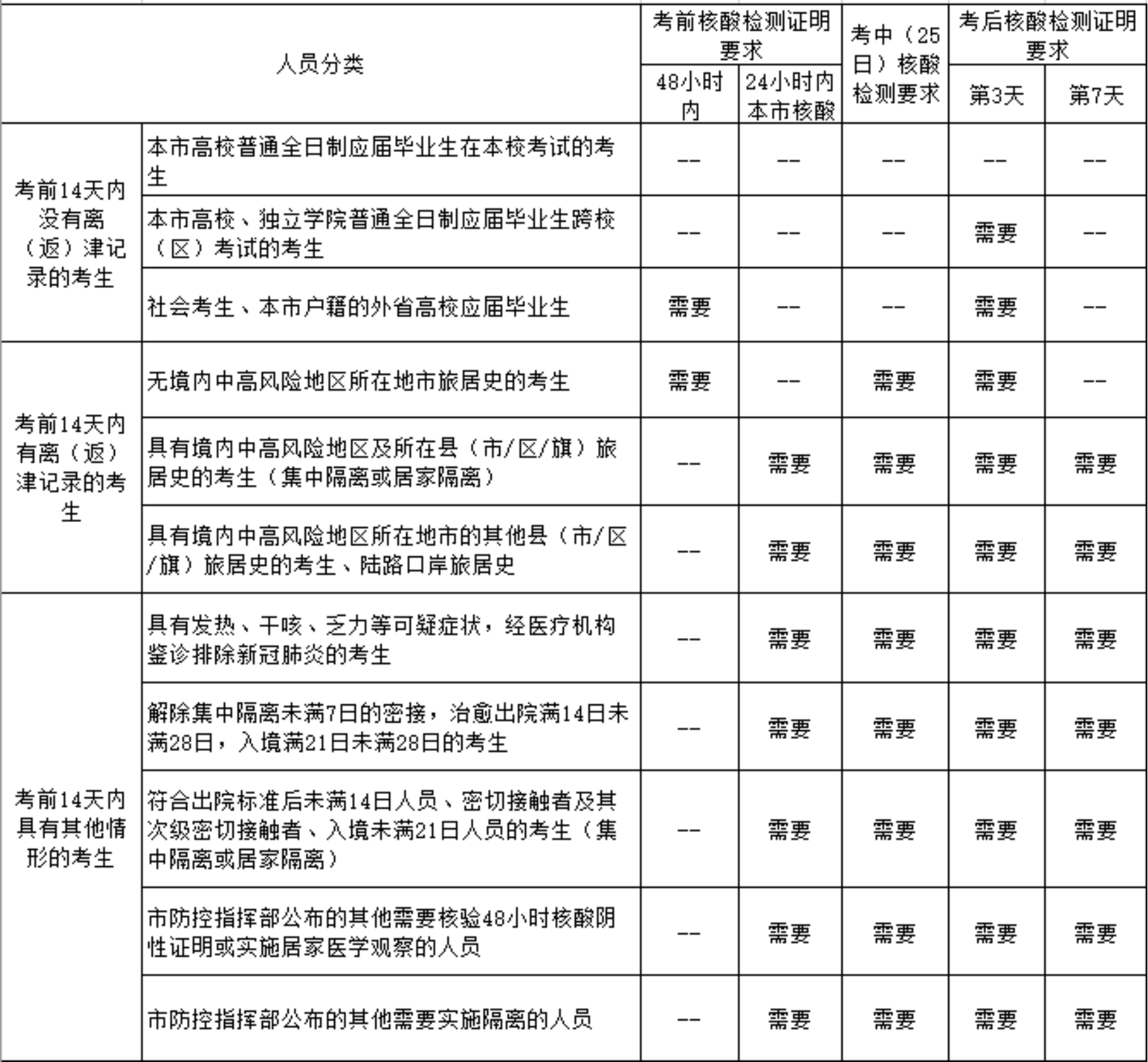 3.考生进入考点时,除进行必要的身份验证外,还须提供天津健康码和通信大数据行程卡。此外,不同的考生群体须按要求在考前、考中、考后提供相应的核酸检测阴性证明(详细要求见附表)。不按要求提供考前、考中核酸检测阴性证明的,不得参加考试。考后须提供核酸检测阴性证明的考生,请在规定时间通过健康监测程序上传核酸检测阴性证明的截图。